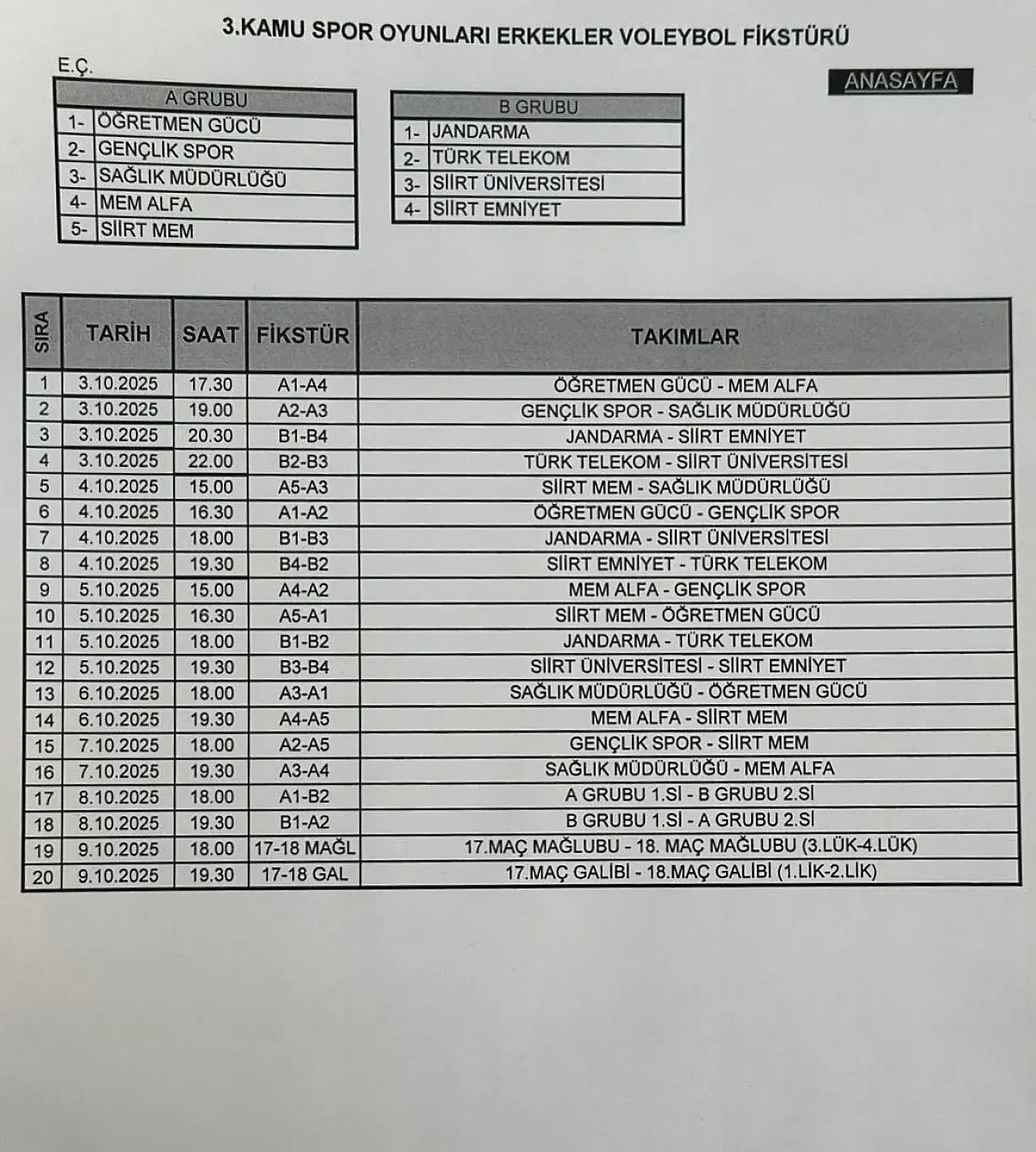 B Grubu: Jandarma, Türk Telekom, Siirt Üniversitesi ve Siirt Emniyet.