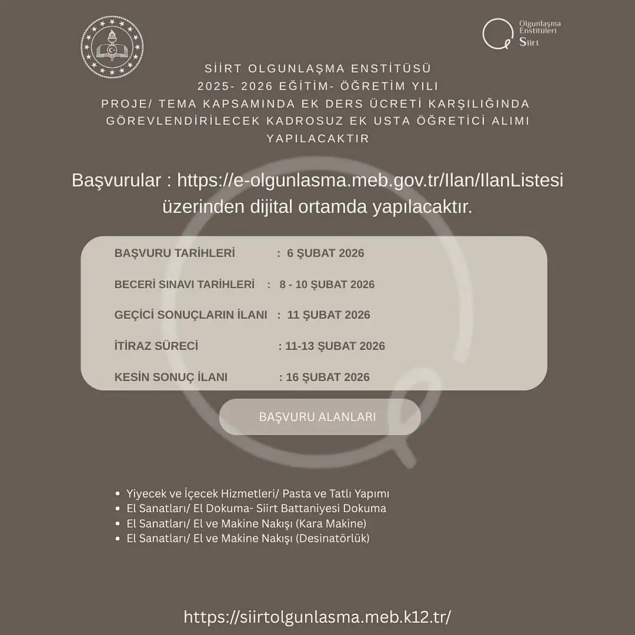 Siirt Olgunlaşma Enstitüsü, 2025-2026 Eğitim-Öğretim Yılı kapsamında yürütülecek tema ve projelerde görevlendirilmek üzere farklı alanlarda usta öğretici alımı yapacağını duyurdu.