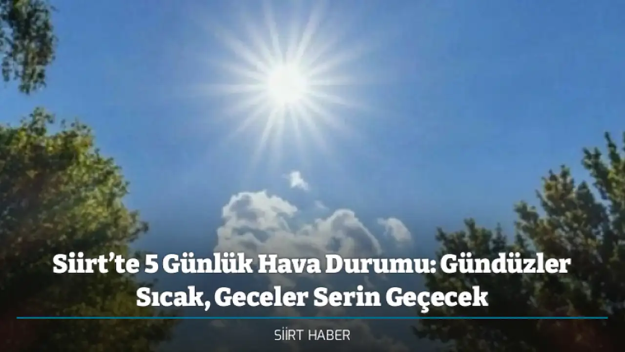 Siirt ve ilçelerinde önümüzdeki beş gün boyunca hava genel olarak az bulutlu olacak. Sıcaklıklar mevsim normalleri civarında seyredecek, gündüz en yüksek 25-26°C, gece en düşük 10-12°C civarında olacak.