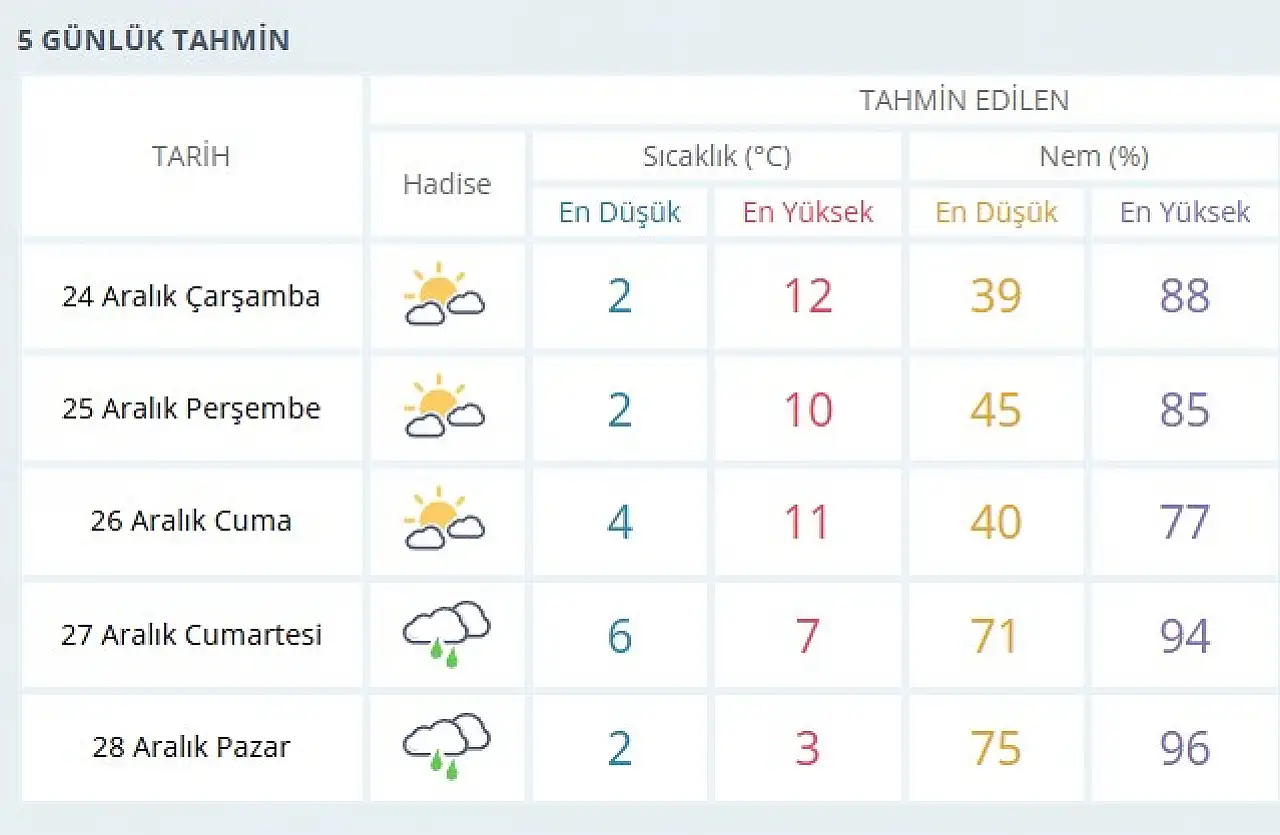 28 Aralık Pazar günü ise yağmur devam ediyor. Günün en düşük sıcaklığı 2 derece, en yüksek sıcaklığı ise 3 derece olarak tahmin ediliyor. Soğuk ve yağışlı hava özellikle dışarı çıkacakları uyarıyor.