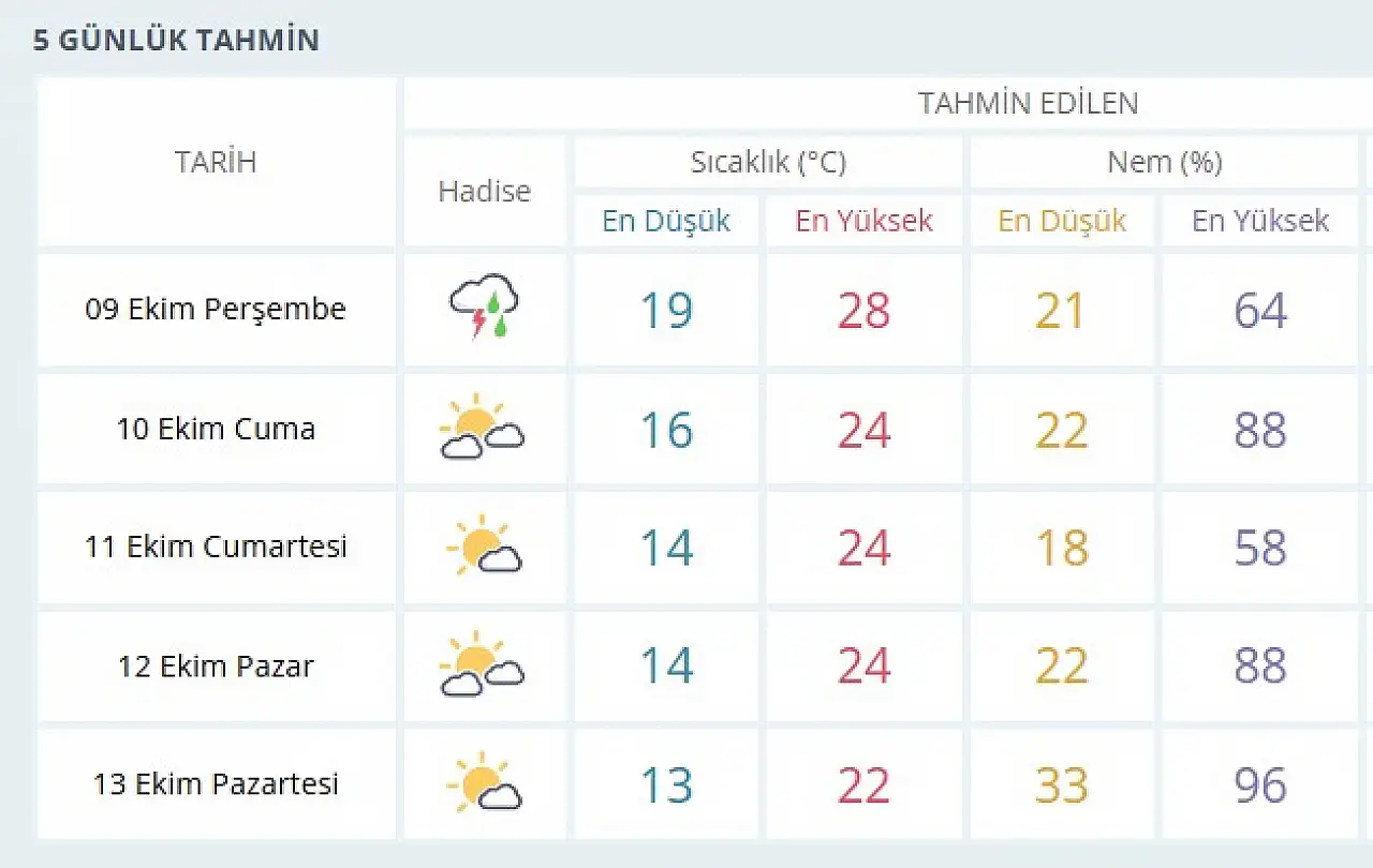 Tarih | Hava Durumu | En Düşük Sıcaklık (°C) | En Yüksek Sıcaklık (°C) |
