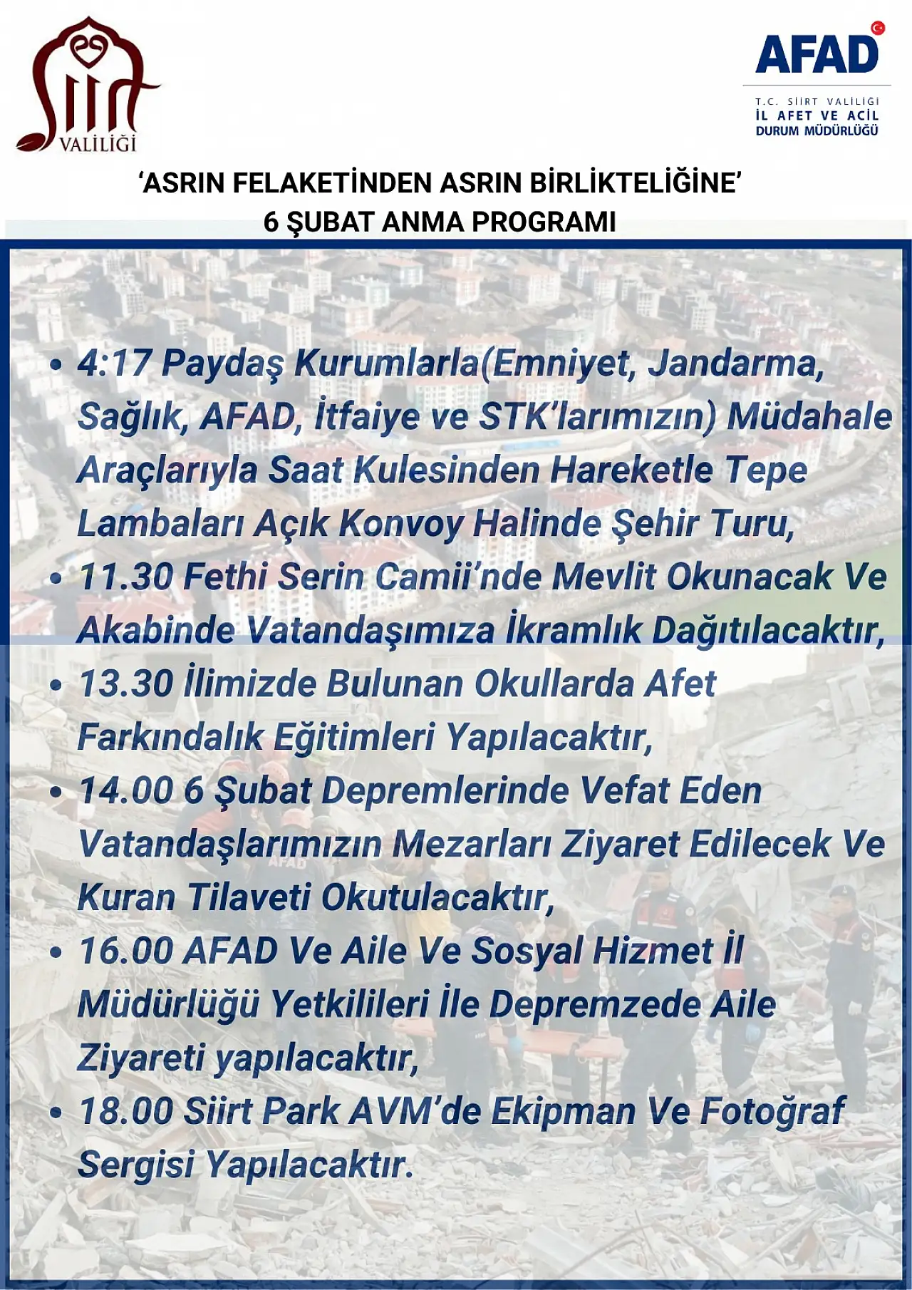 Kahramanmaraş merkezli 6 Şubat depremlerinde hayatını kaybeden vatandaşlar, felaketin yıl dönümünde Siirt'te düzenlenecek kapsamlı bir programla anılacak.