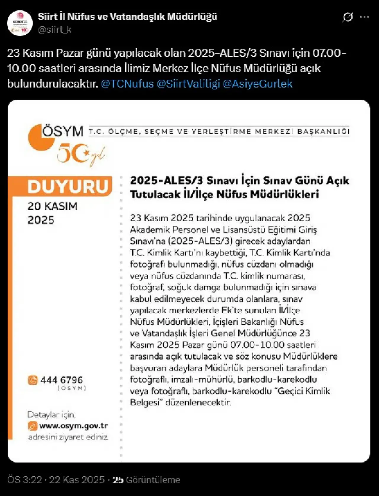 Siirt Merkez İlçe Nüfus Müdürlüğü, 23 Kasım'daki 2025-ALES/3 Sınavı için 07.00-10.00 saatleri arasında açık olacak.