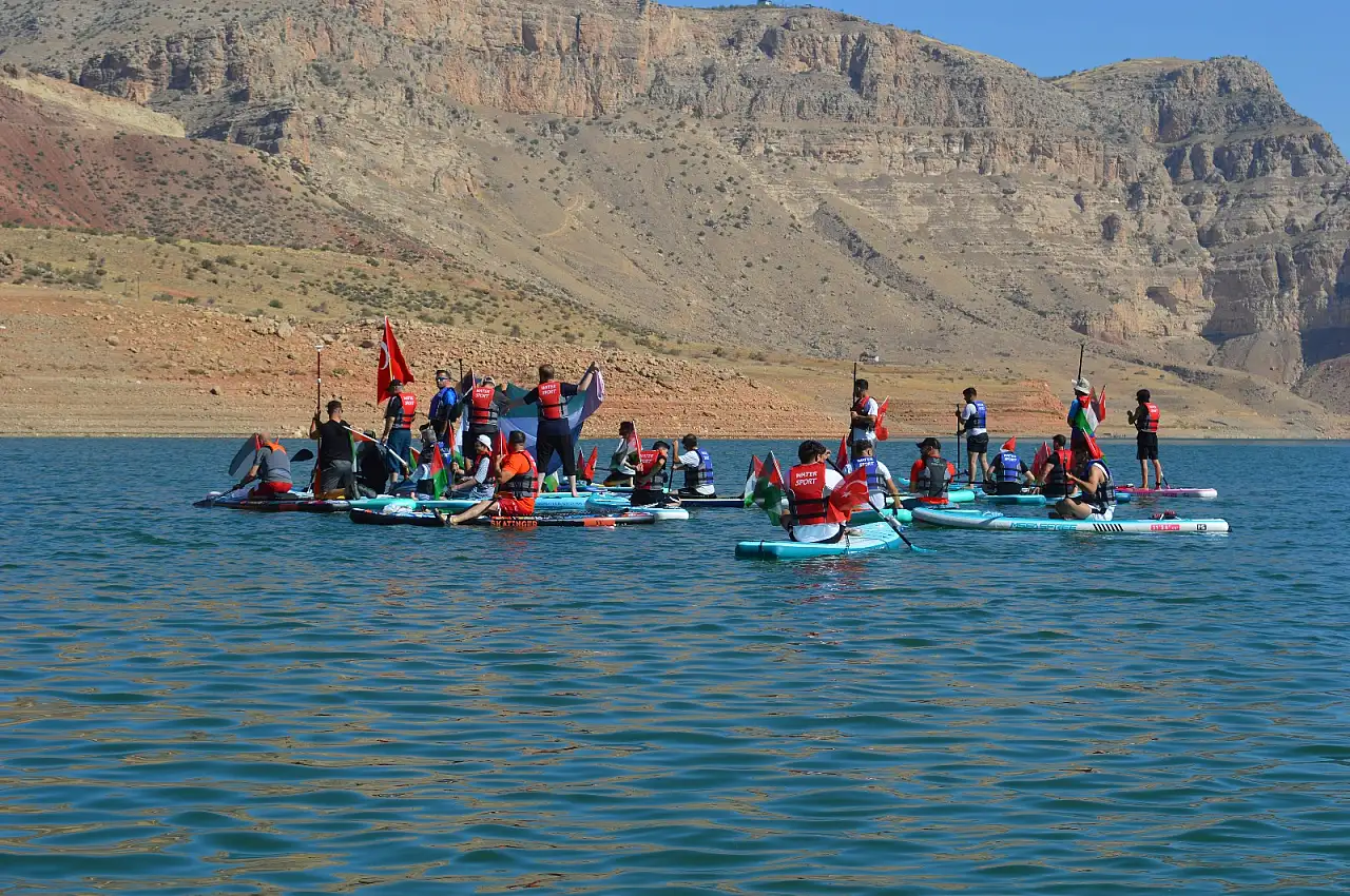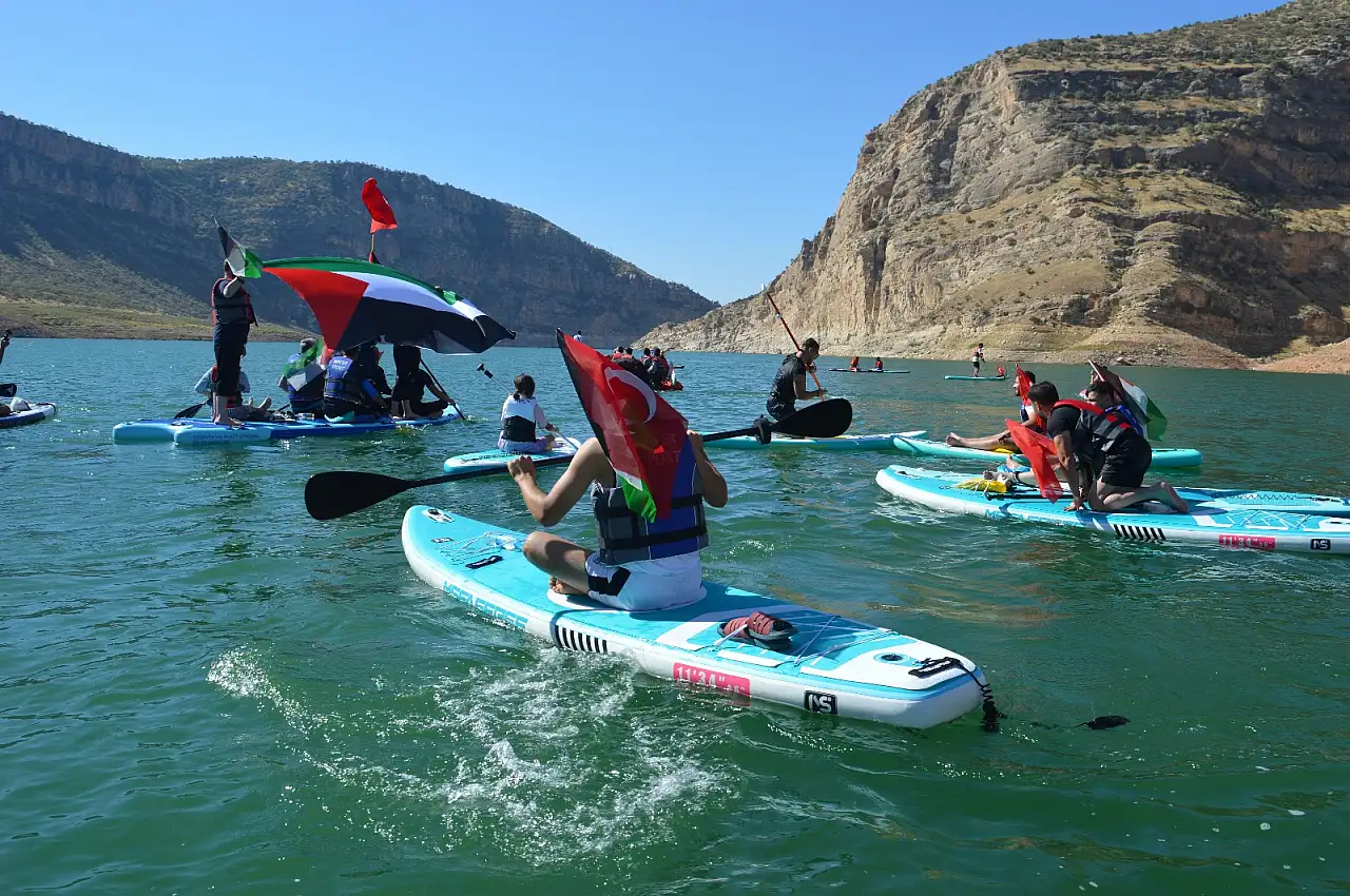 Etkinlik kapsamında kano, bot ve küçük teknelerle Botan Çayı üzerinde kortej oluşturan katılımcılar, Türk ve Filistin bayraklarıyla donatılmış araçlarla “Sumud Filosu”nu temsilen gölde tur attı.