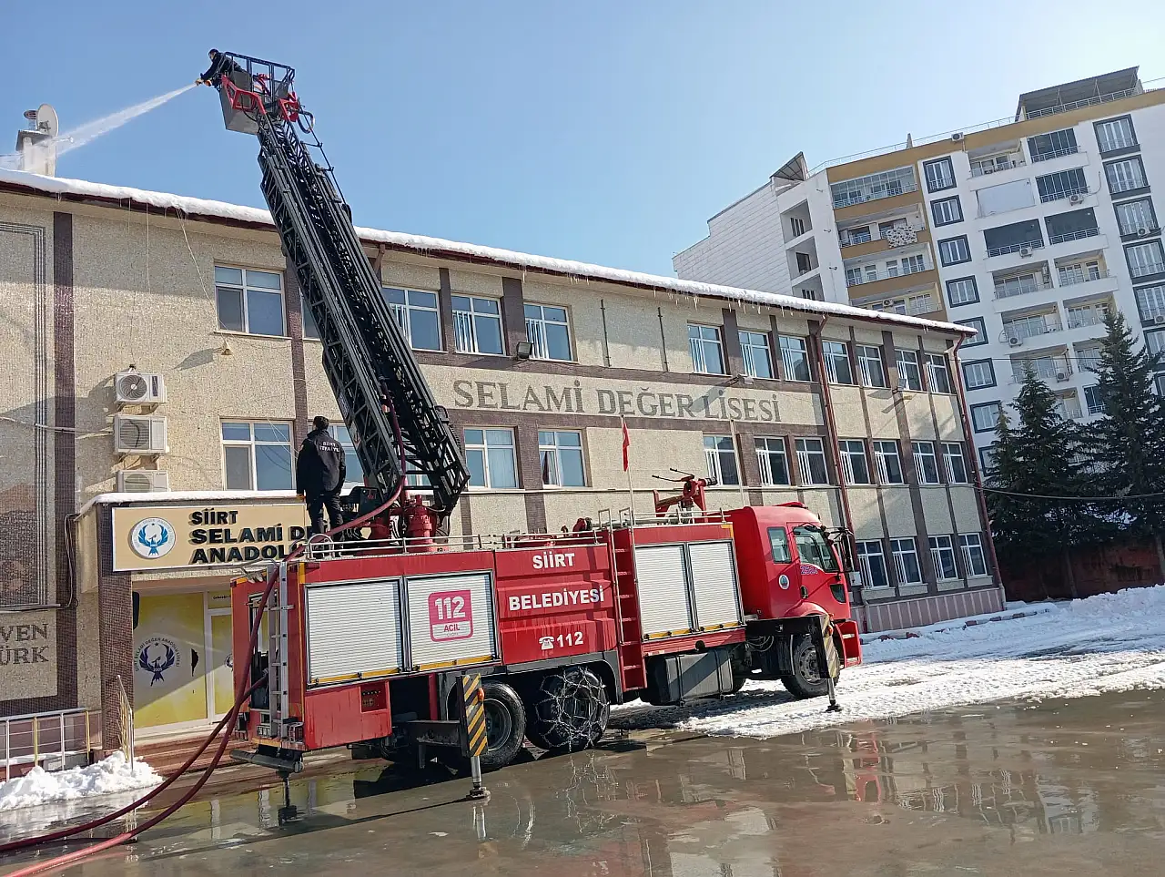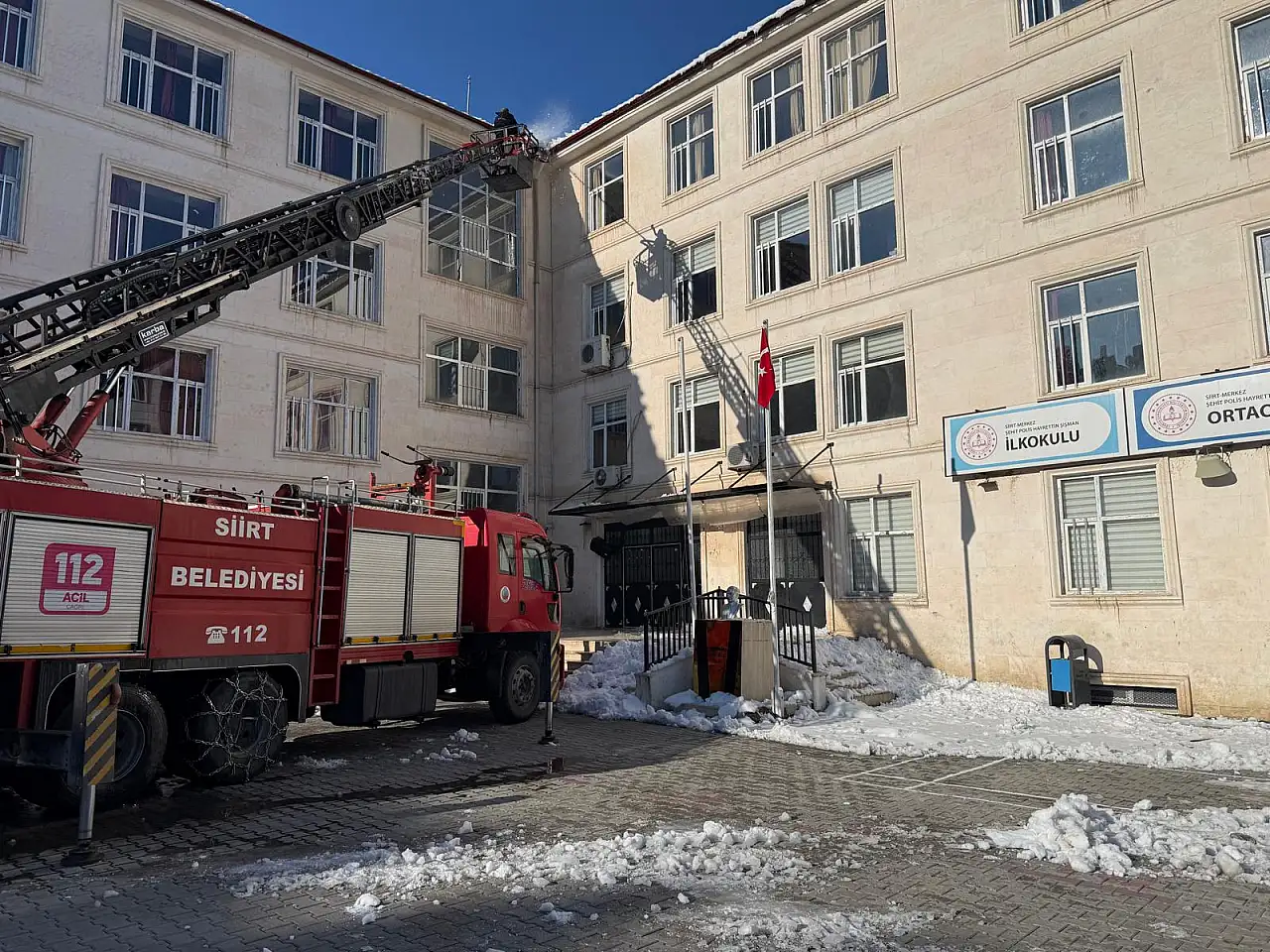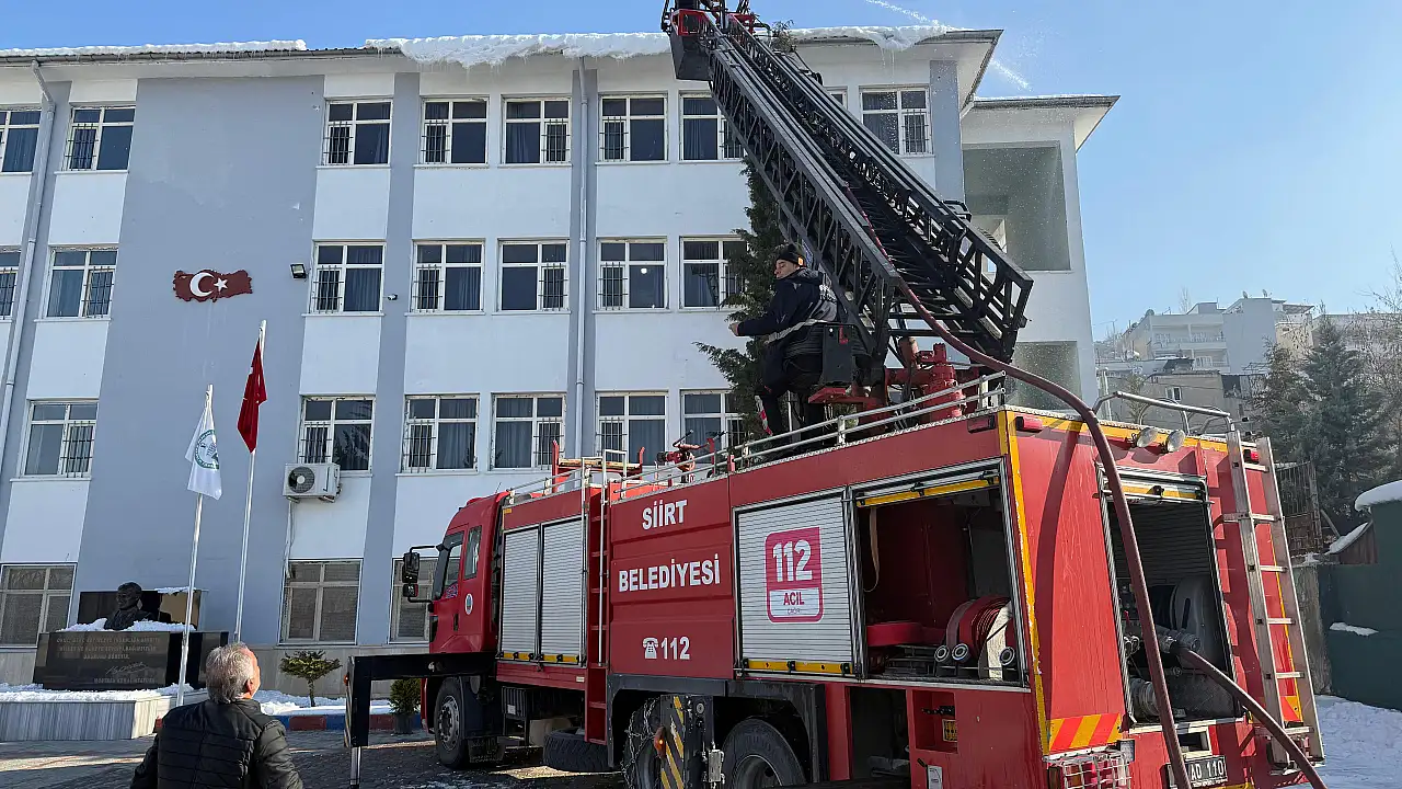 Siirt Belediyesi İtfaiye Müdürlüğü ekipleri, yaya ve araç trafiğinin yoğun olduğu cadde ve sokakların yanı sıra okul binaları başta olmak üzere kamu kurumlarında önlem aldı. Çatı ve saçaklarda biriken kar kütleleri, merdivenli itfaiye araçları kullanılarak kontrollü şekilde temizleniyor.