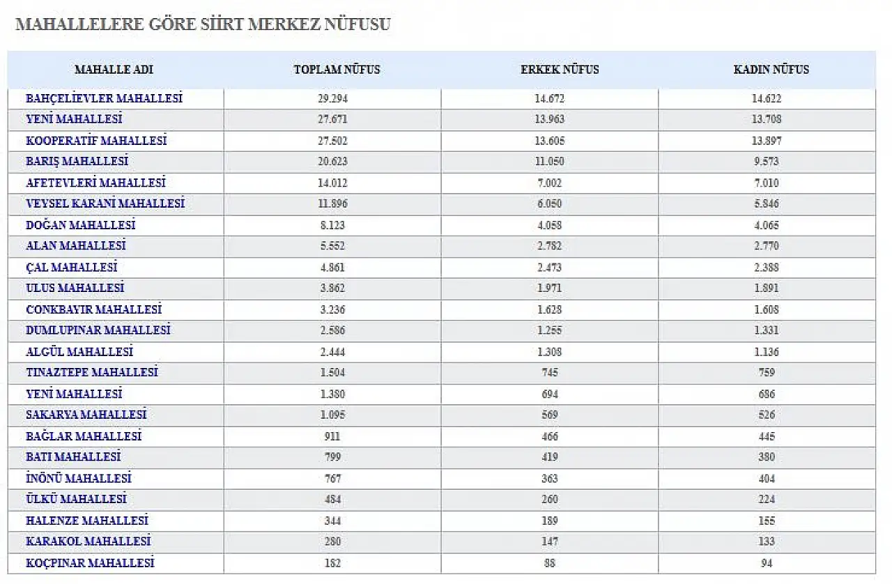 Siirt merkez mahallelerine ait güncel nüfus verileri açıklandı. Açıklanan rakamlara göre kentin en kalabalık ve en az nüfuslu mahalleleri netleşirken, mahallelerdeki erkek ve kadın nüfus dağılımı da ortaya çıktı.
