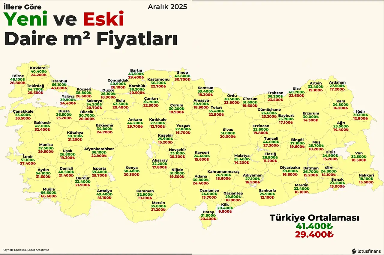 Türkiye genelinde konut fiyatları yükselmeye devam ederken, vatandaş için asıl sorun rakamların değil, o rakamlara yetişemeyen gelirlerin olması. Aralık 2025 verileri, yeni dairelerde Türkiye ortalamasının 41 bin 400 TL/m², eski dairelerde ise 29 bin 400 TL/m² seviyesine çıktığını gösteriyor.