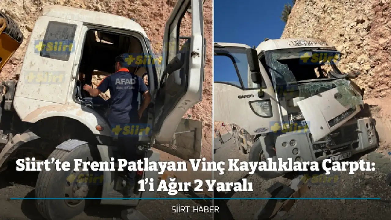 Siirt'in Eruh karayolu üzerinde freni patlayan vinç kontrolden çıkarak kayalıklara çarptı. Meydana gelen kazada 1'i ağır 2 kişi yaralandı.