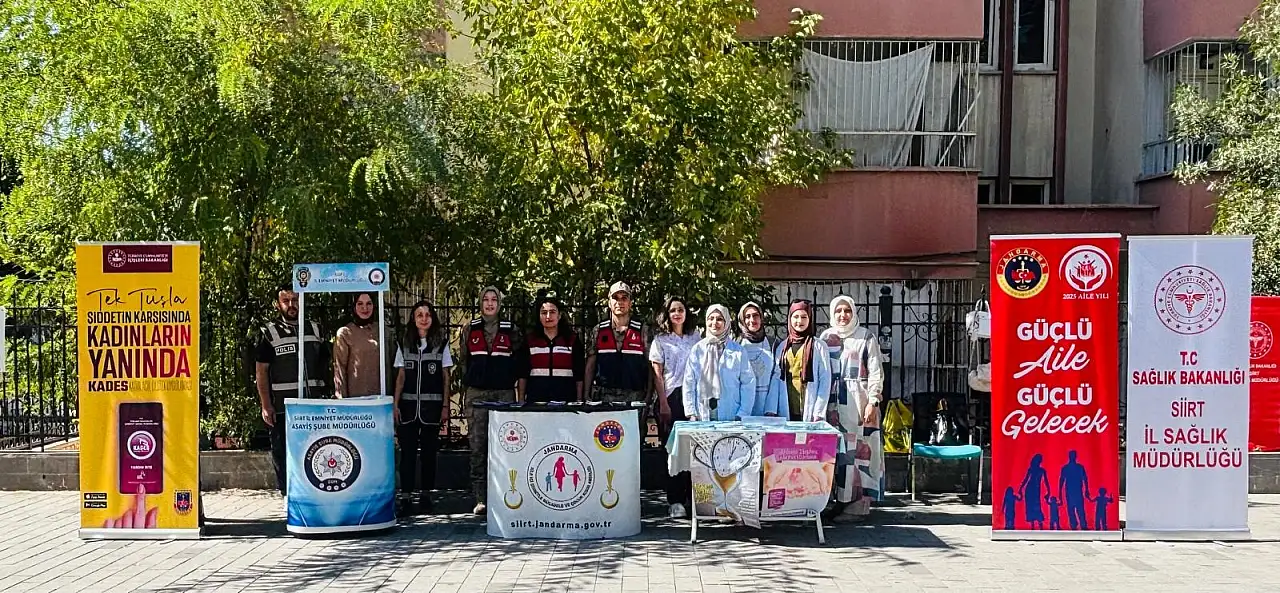 Siirt İl Jandarma Komutanlığı, İl Emniyet Müdürlüğü Aile İçi ve Kadına Karşı Şiddetle Mücadele Büro Amirliği ile İl Toplum Sağlığı Merkezi’nin ortaklaşa yürüttüğü “Güçlü Aile Güçlü Gelecek” projesi çerçevesinde Güres Caddesi’nde bilgilendirme standı kuruldu.