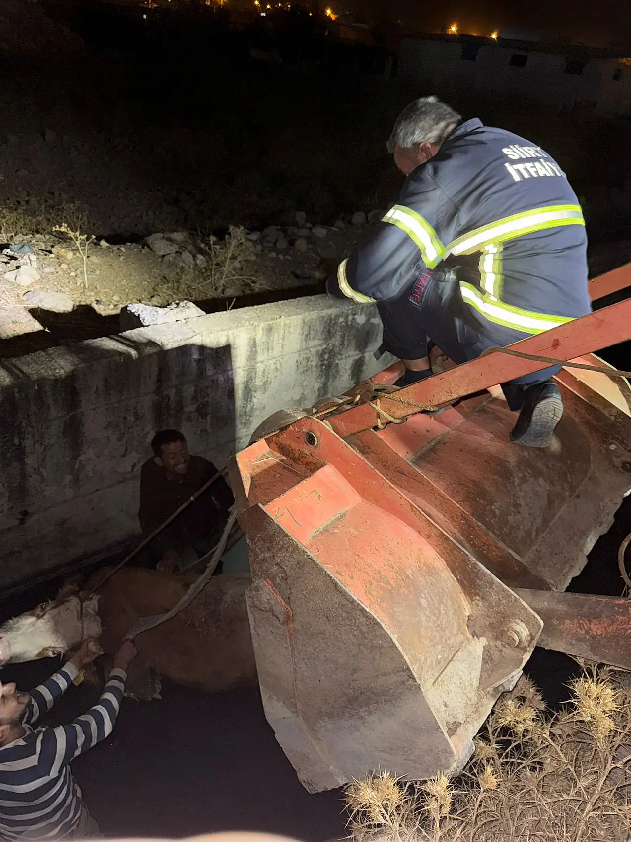 Siirt'in Şavuran Mahallesi'nde pis su arıtma kanalına düşen bir inek, itfaiye ve kepçe yardımıyla kurtarıldı.