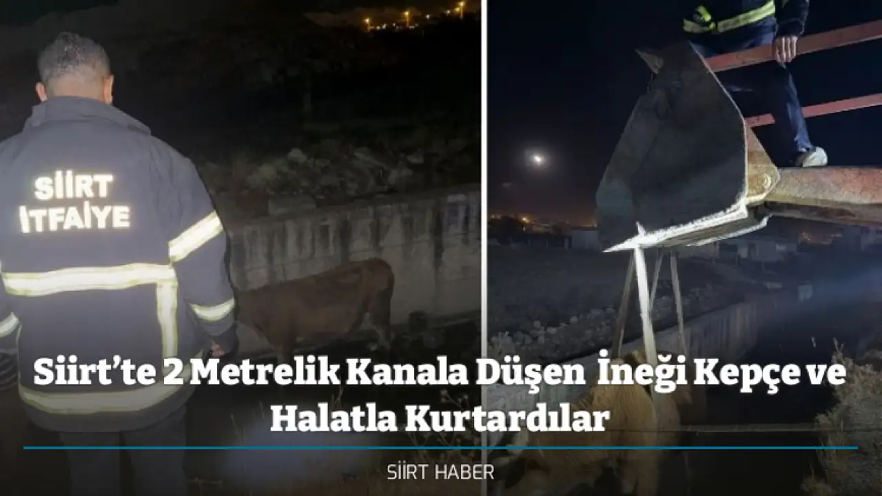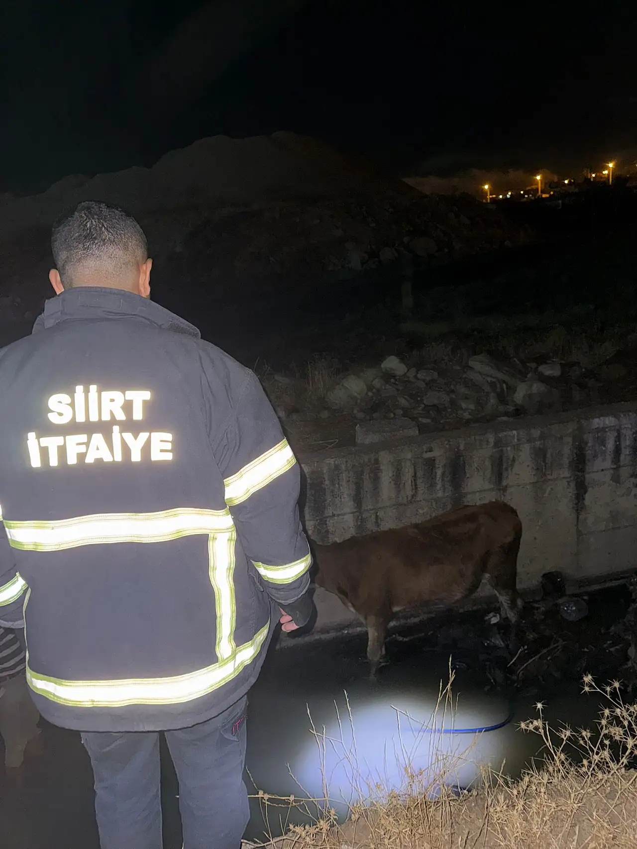 Edinilen bilgilere göre, yaklaşık 2 metre derinliğindeki kanala düşerek mahsur kalan ineğin kurtarılması için çevredekilerin ihbarı üzerine Siirt Belediyesi İtfaiye Müdürlüğü ekipleri bölgeye sevk edildi. Kepçe desteğiyle çukura ulaşan ekipler, halat yardımıyla ineği bulunduğu yerden çıkardı.