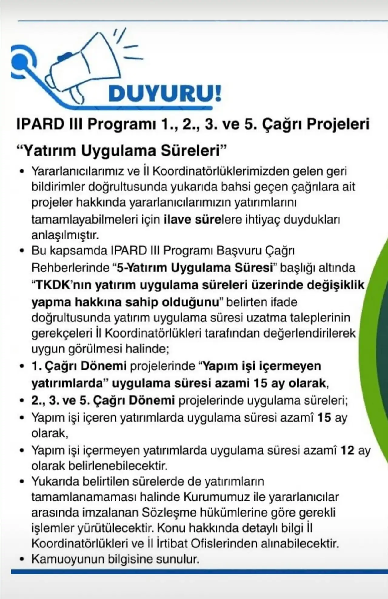 Yapılan açıklamada; yararlanıcılar ve il koordinatörlüklerinden gelen geri bildirimler doğrultusunda, IPARD III Programı 1., 2., 3. ve 5. çağrı dönemleri kapsamında desteklenen projelerde yatırımların tamamlanabilmesi için ilave süre ihtiyacı oluştuğu ifade edildi. Bu kapsamda, başvuru çağrı rehberlerinde yer alan ve TKDK’ya yatırım uygulama süreleri üzerinde değişiklik yapma yetkisi tanıyan hükümlere dayanılarak süre uzatımı taleplerinin değerlendirileceği belirtildi.
