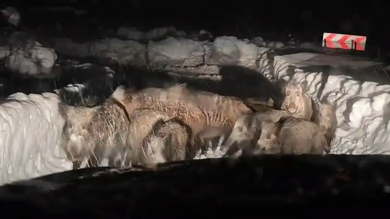 İl Özel İdaresi ekiplerinin yol açma ve kar temizleme çalışmaları esnasında ortaya çıkan domuzların, toplu halde ilerledikleri görüldü. O anlar çevrede bulunanlar tarafından cep telefonu kamerasıyla kayda alındı.