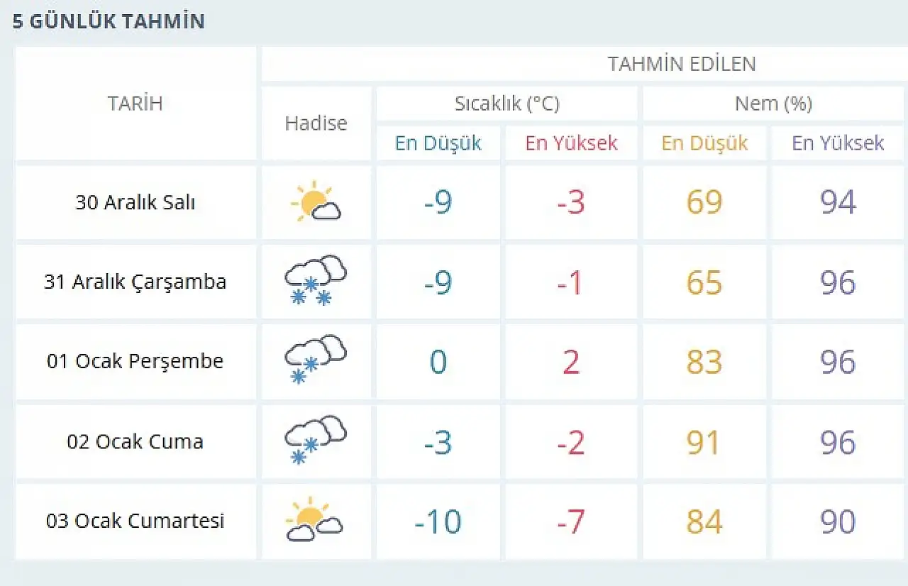 Yeni yıl arifesinde kent genelinde yoğun kar yağışı bekleniyor. Sıcaklıkların -9 ile -1 derece arasında seyredeceği tahmin edilirken, nem oranı yüksek olacak. Kar yağışıyla birlikte ulaşımda aksamalar yaşanabileceği belirtiliyor.