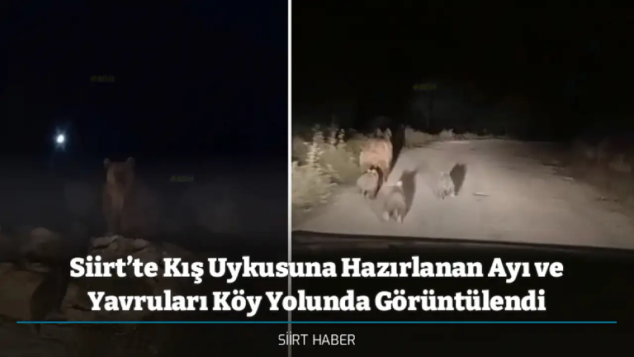 Siirt'in Eruh ilçesinde, kış uykusuna yatmadan önce yiyecek arayışına çıkan ayı ve yavruları köy yoluna indi. O anlar bir vatandaşın cep telefonu kamerasına yansıdı.