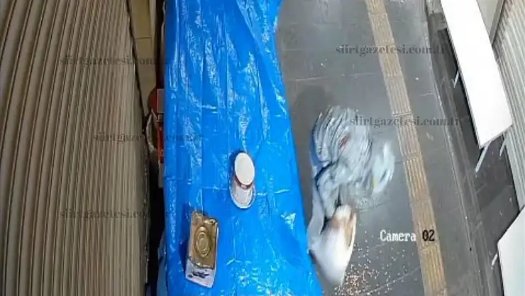 Siirt'te bir kuruyemiş işletmesinin önünde bulunan ve muşamba ile örtülü tezgahın altına bırakılan fıstık çuvalı, gece saatlerinde kimliği belirsiz bir kişi tarafından çalındı. O anlar iş yerinin güvenlik kamerasına saniye saniye yansıdı.