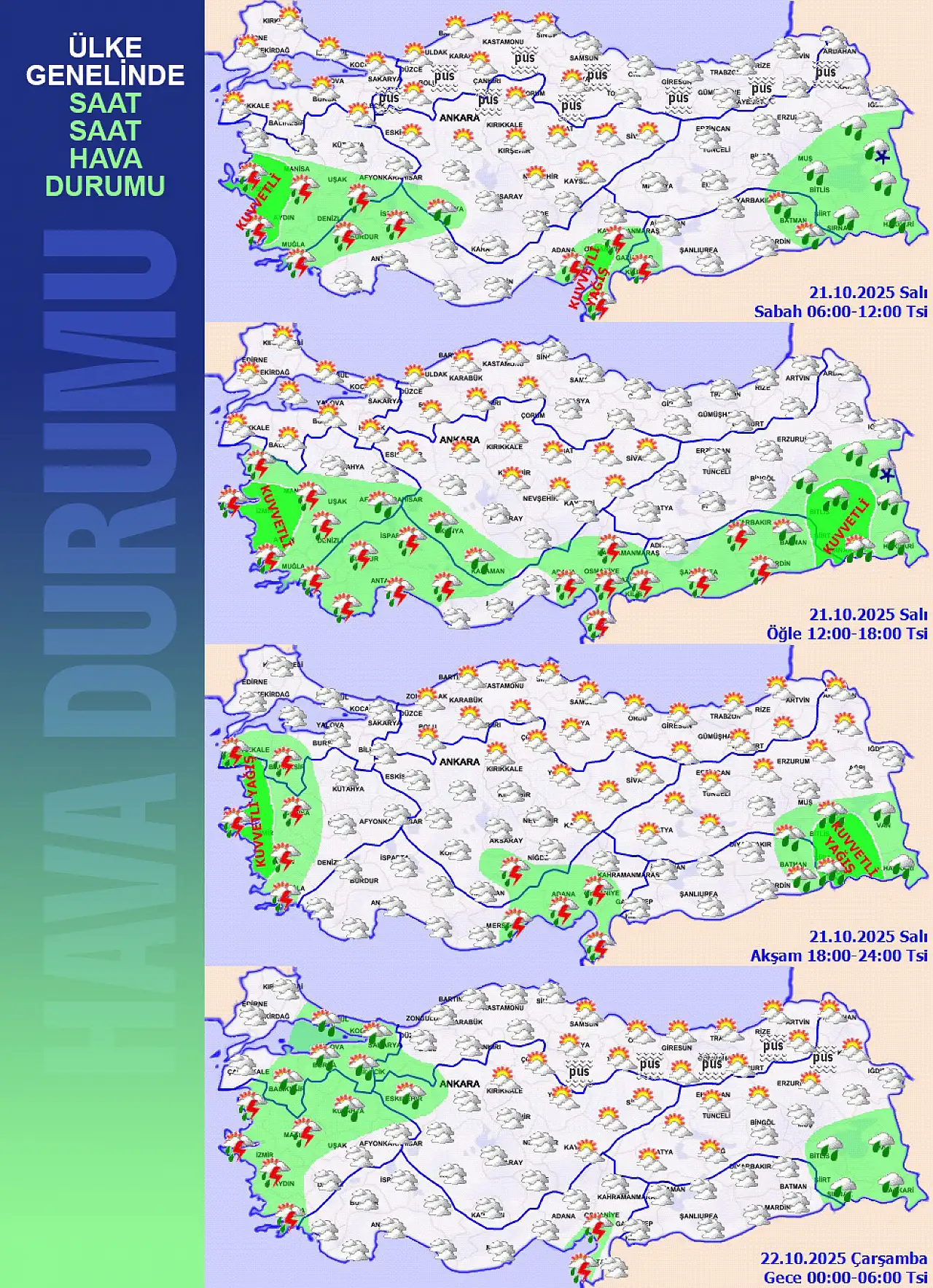 “Kıyı Ege, Osmaniye, Hatay kıyıları, Bitlis, Şırnak ve Siirt çevreleri ile Van ve Hakkari’nin batı ilçelerinde yerel kuvvetli yağış beklendiğinden; ani sel, su baskını, yıldırım, kısa süreli kuvvetli rüzgâr ve yerel dolu yağışı gibi olumsuzluklara karşı dikkatli ve tedbirli olunmalıdır.”