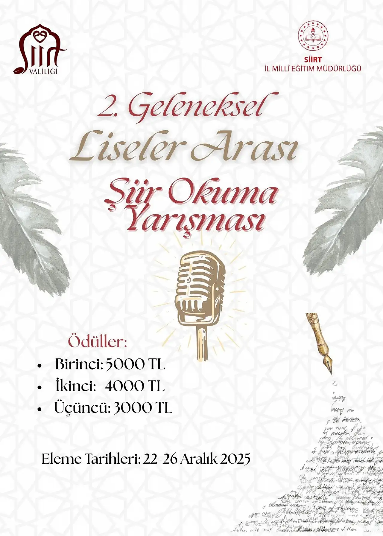 Siirt İl Millî Eğitim Müdürlüğü tarafından düzenlenen 2. Geleneksel Liseler Arası Şiir Okuma Yarışması, 22–26 Aralık 2025 tarihleri arasında yapılacak eleme turlarıyla başlayacak. Yarışmada dereceye giren öğrencilere toplam 12 bin TL ödül verilecek.