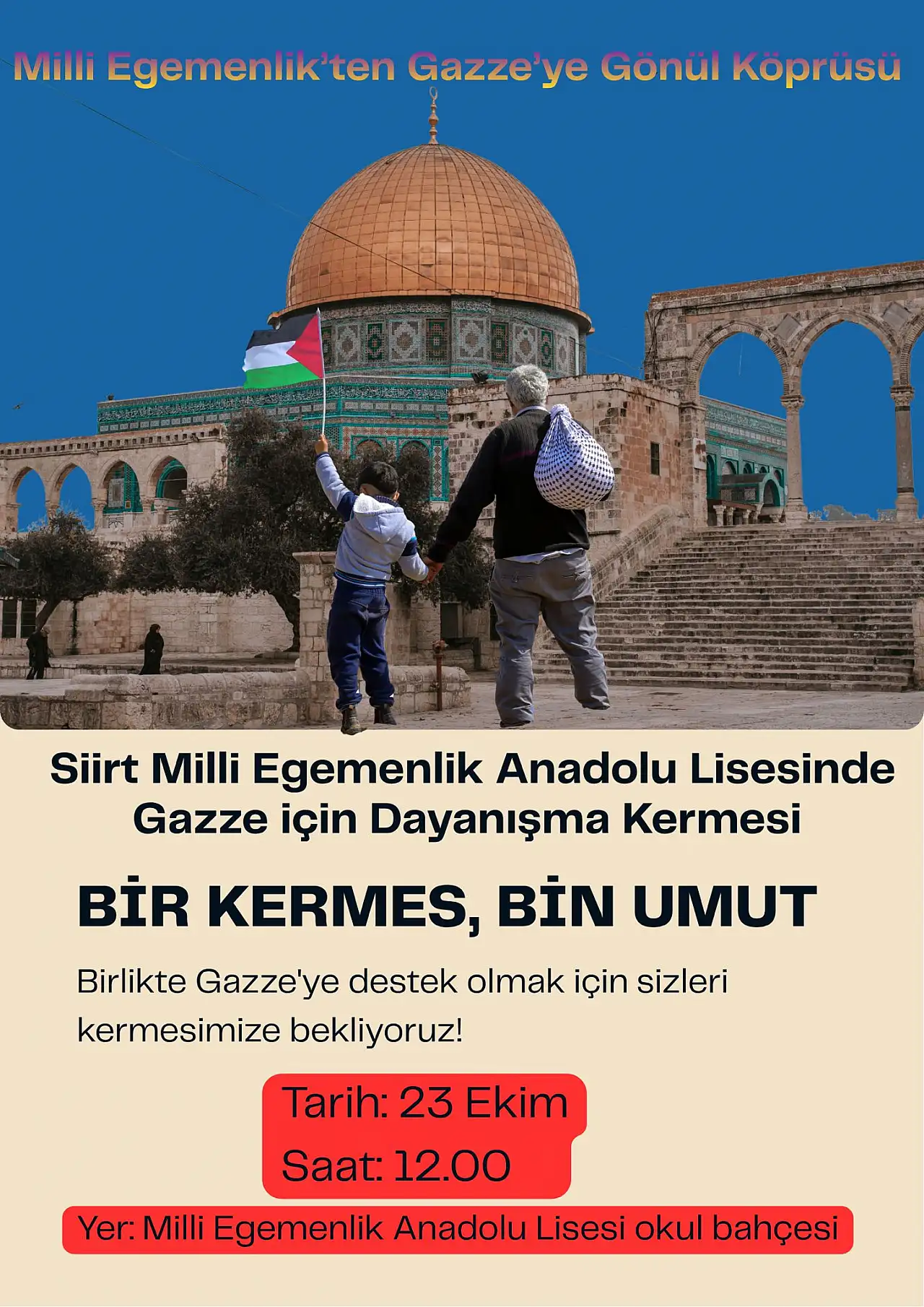 Okul bahçesinde 23 Ekim Perşembe günü saat 12.00’de gerçekleştirilecek “Bir Kermes, Bin Umut” etkinliğiyle toplanacak gelirlerin Gazze’ye yardım amacıyla kullanılacağı belirtildi.