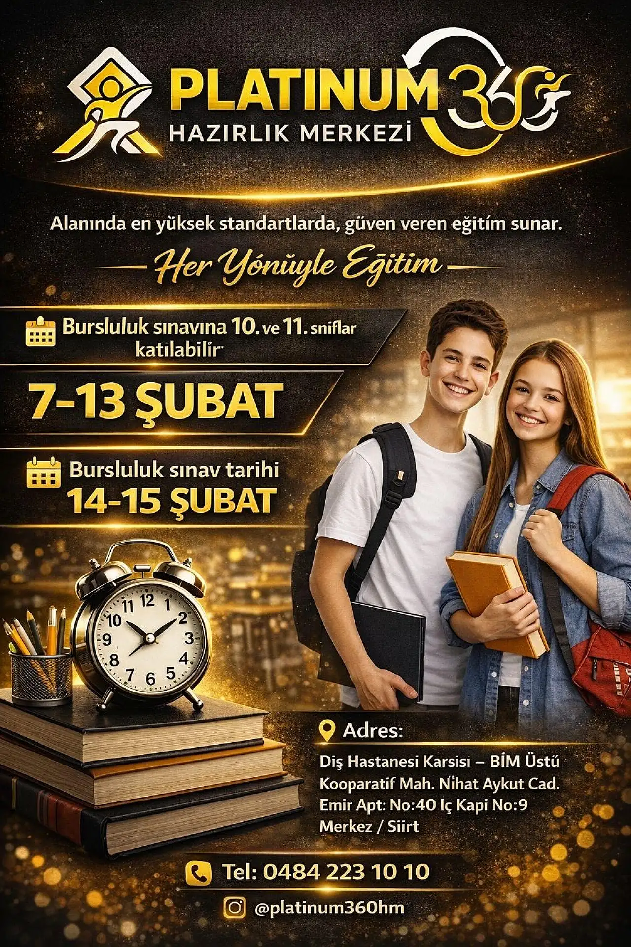 Siirt'te eğitim faaliyetlerini sürdüren Platinum 360 Hazırlık Merkezi, 10. ve 11. sınıf öğrencilerine yönelik bursluluk sınavı düzenleyeceğini duyurdu başvurular 7–13 Şubat tarihleri arasında alınacak.