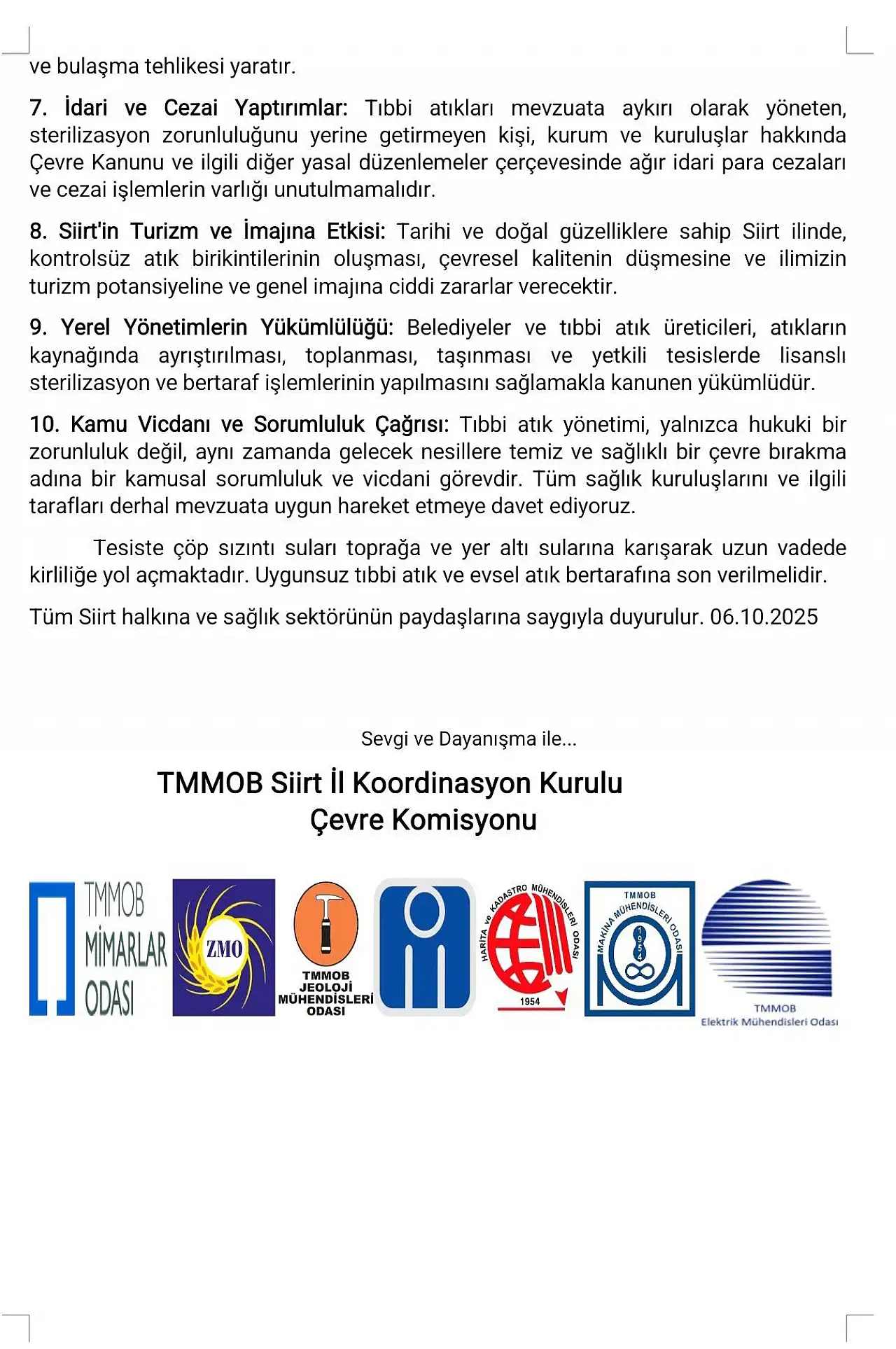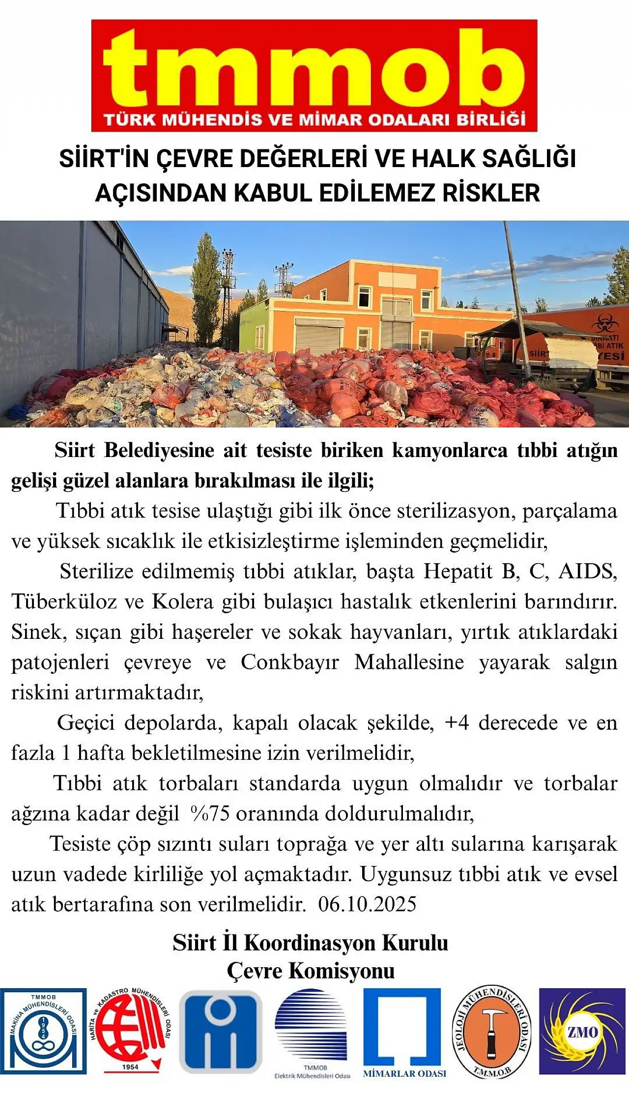 TMMOB Siirt İl Koordinasyon Kurulu, tesisteki uygunsuz tıbbi atık birikimine son verilmesini ve gerekli önlemlerin derhal alınmasını kamuoyuna duyurdu.