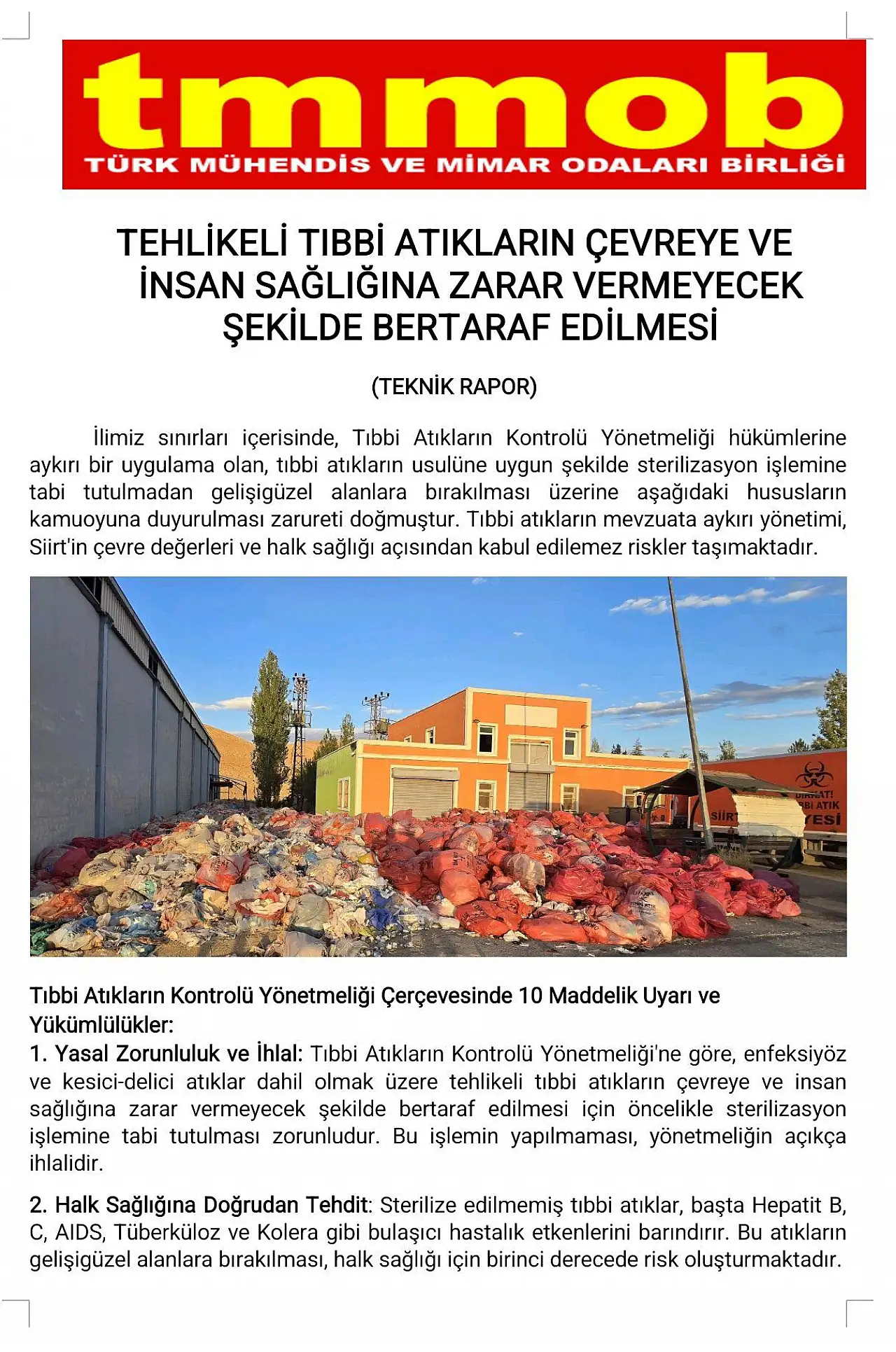 TMMOB Siirt İl Koordinasyon Kurulu, sterilize edilmeden gelişigüzel alanlara bırakılan tıbbi atıkların halk sağlığı ve çevre için ciddi riskler oluşturduğunu açıkladı. Yetkililer, acil önlem çağrısında bulundu.