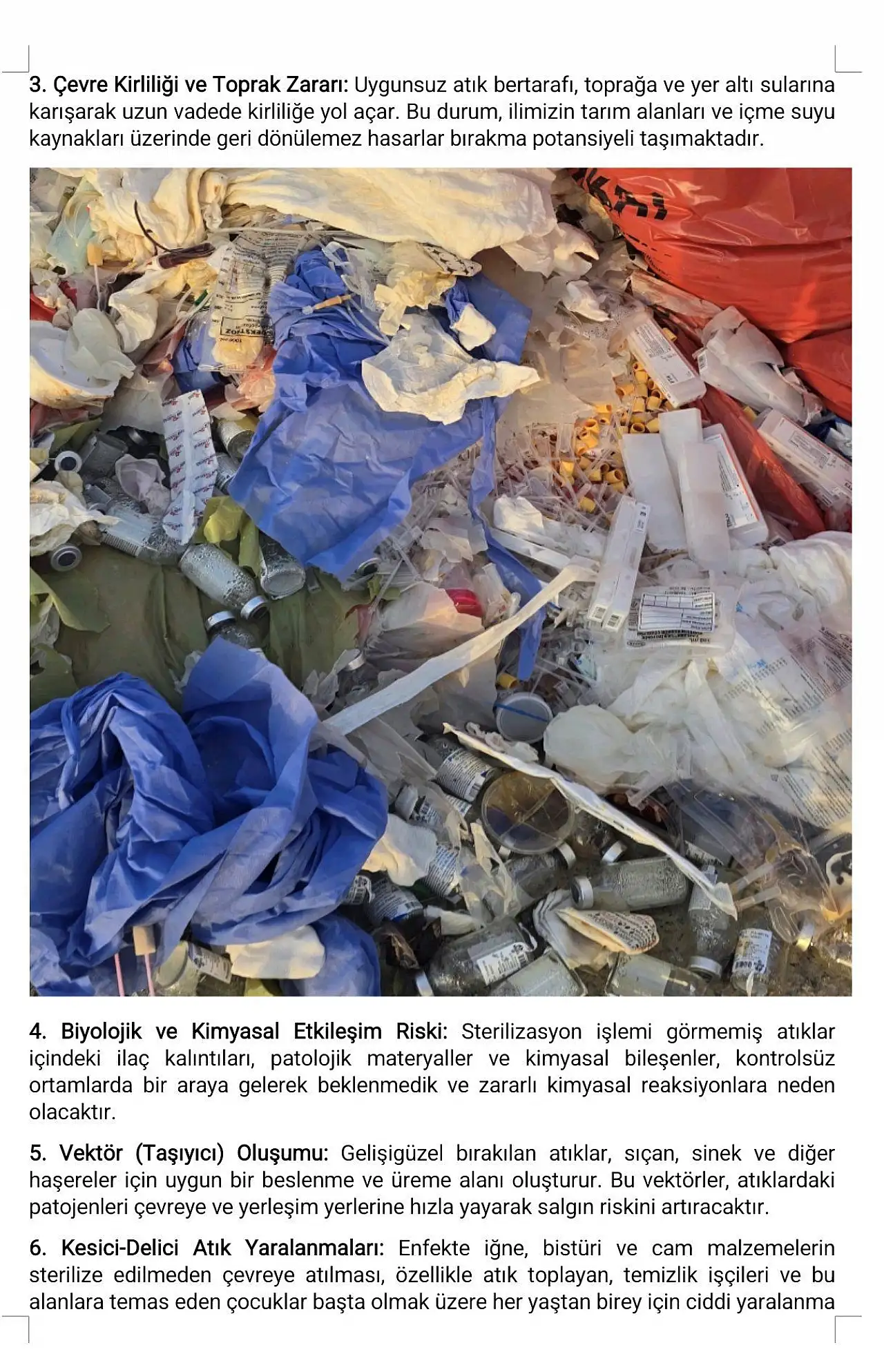 Kurul, tüm sağlık kuruluşlarını ve ilgili tarafları mevzuata uygun hareket etmeye davet ederek, tıbbi atık ve evsel atıkların çevreye zarar vermeyecek şekilde bertaraf edilmesini acil olarak talep etti. Açıklamada, “Tıbbi atık yönetimi, yalnızca hukuki bir zorunluluk değil, gelecek nesillere temiz ve sağlıklı bir çevre bırakma adına bir kamusal sorumluluk ve vicdani görevdir” denildi.