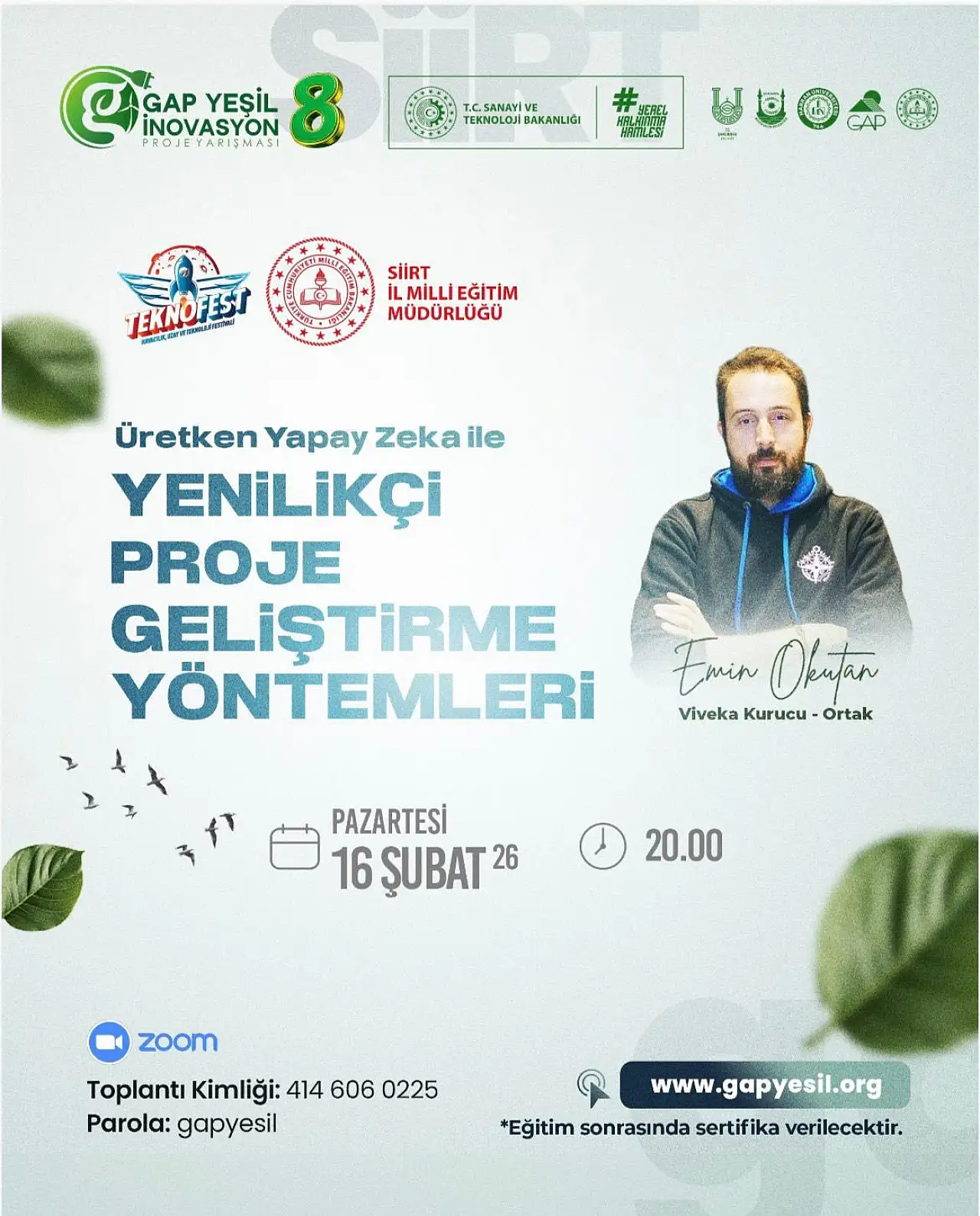 Siirt İl Millî Eğitim Müdürlüğü, GAP Yeşil İnovasyon Proje Yarışması ve TEKNOFEST vizyonu kapsamında çevrim içi bir eğitime ev sahipliği yapacak.
