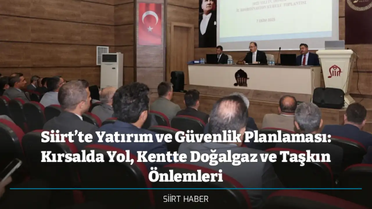 Siirt Valisi Dr. Kemal Kızılkaya başkanlığında 2025 Yılı 4. Dönem İl Koordinasyon Kurulu ve Siirt Taşkın Koruma Koordinasyon Toplantısı gerçekleştirildi. Toplantıda, il genelindeki kamu yatırımlarının takibi, kurumlar arası koordinasyonun güçlendirilmesi ve projelerin etkin yürütülmesi ele alındı.