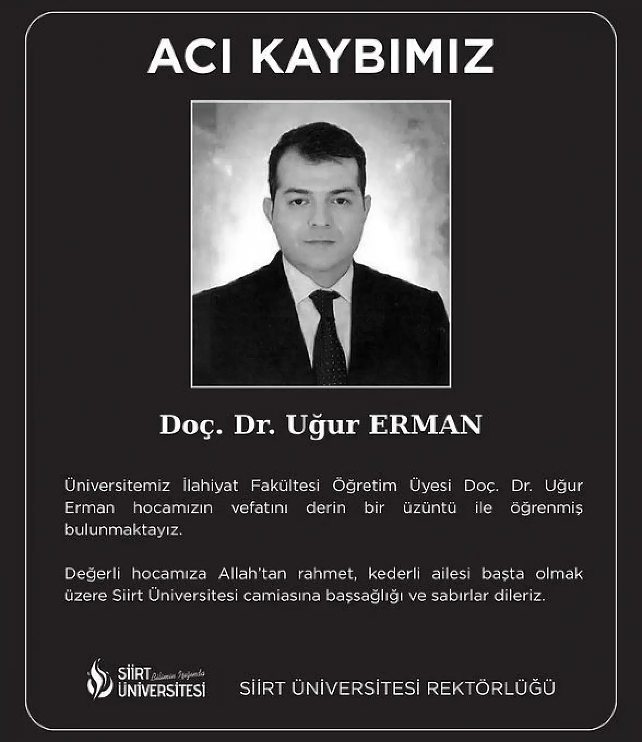 Siirt Üniversitesi Rektörlüğü tarafından yayımlanan taziye mesajında, Doç. Dr. Uğur Erman’a Allah’tan rahmet; kederli ailesine, yakınlarına ve üniversite camiasına başsağlığı ve sabır dilekleri iletildi.