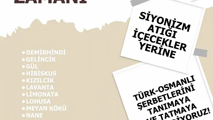 Siyonizmi destekleyen firmaların ürünlerini kararlı ve devamlı bir şekilde boykot ediyoruz! Siyonizm atığı içecekler yerine sizleri Türk-Osmanlı mutfağının geleneksel şerbetleriyle tanışmaya ve birbirinden değerli şerbetleri tatmaya davet ediyoruz. Kermesten elde edilen gelirlerle Filistinli kardeşlerimize destek oluyoruz.