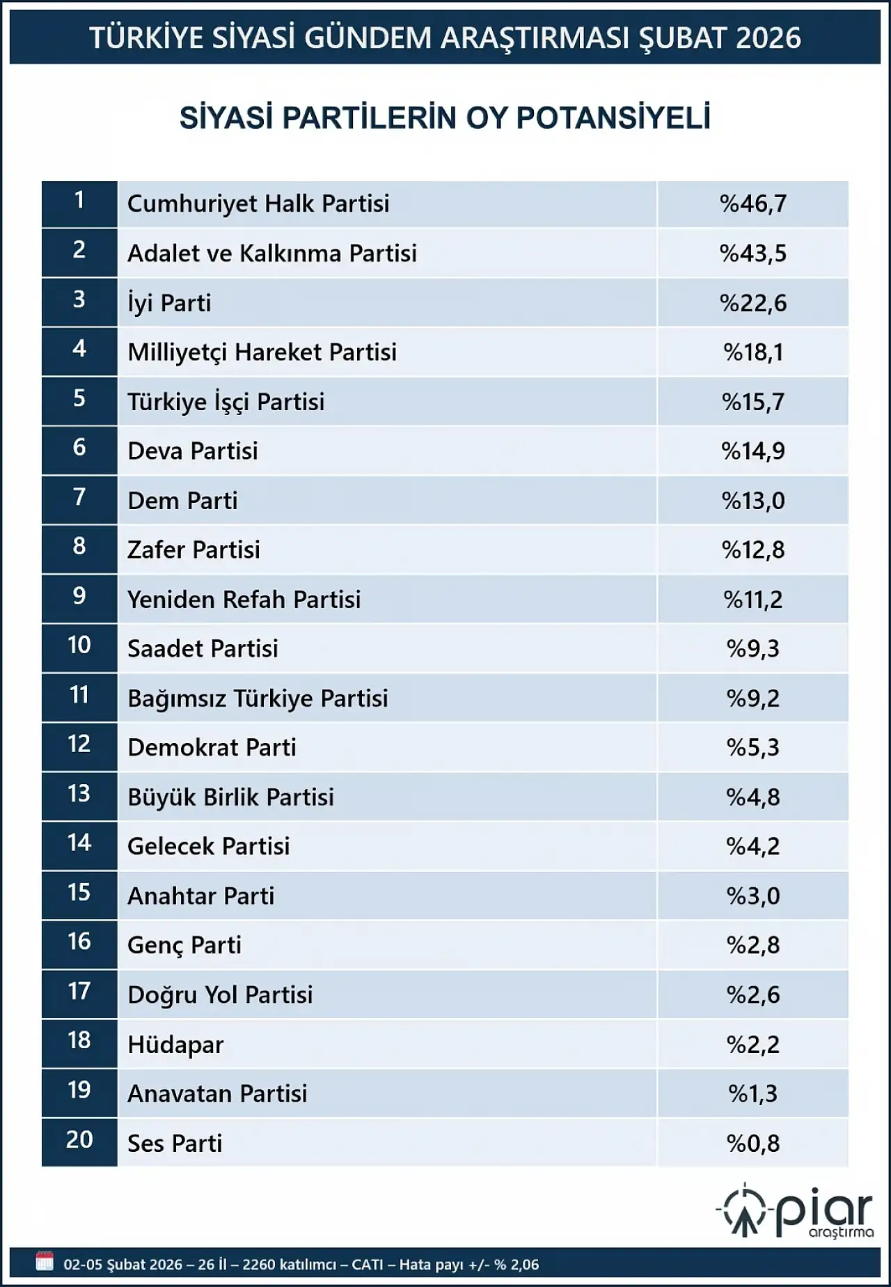 02–05 Şubat 2026 tarihleri arasında yapılan çalışmada siyasi partilerin oy potansiyelleri ölçülürken, ortaya çıkan tablo dikkat çekti.