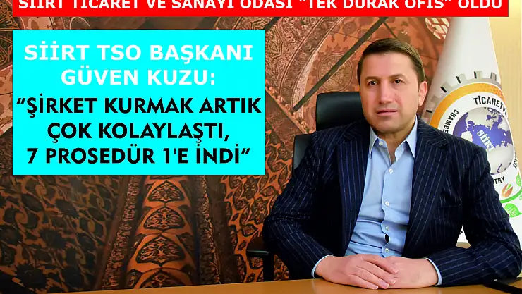 SİİRT TİCARET VE SANAYİ ODASI 'TEK DURAK OFİS' OLDU: Siirt Ticaret ve Sanayi Odası Yönetim Kurulu Başkanı Güven Kuzu, 'Şirket kurmayı kolaylaştıran düzenlemenin yürürlüğe girmesi, Ticaret Sicil Müdürlüklerinin 'Tek Durak Ofise' dönüşmesi ve 7 prosedürün 1