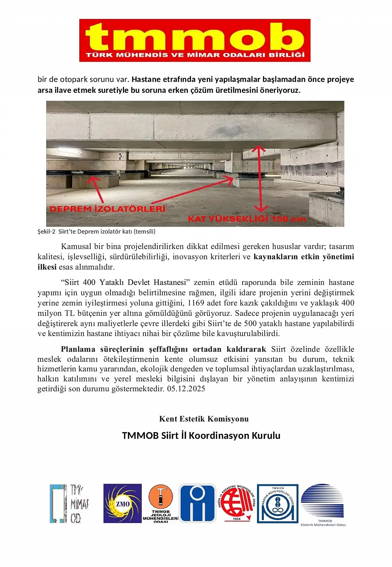 Muş’ta benzer bir problemle karşılaşıldığını, izolatör katı yalnızca 130 cm yükseltilerek tüm bir katın otoparka dönüştürüldüğünü hatırlatan komisyon, Siirt’te böyle bir çözümün “değerlendirilmediğini” ifade etti.