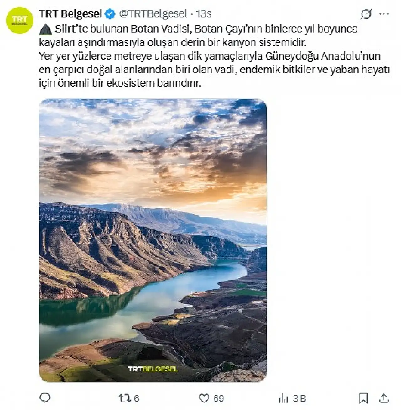 TRT Belgesel, resmi sosyal medya hesabından yaptığı paylaşımda Siirt’te yer alan Botan Vadisi’ne dikkat çekti. Paylaşımda, Botan Çayı’nın binlerce yıl boyunca kayaları aşındırmasıyla oluşan vadinin derin bir kanyon sistemi oluşturduğu belirtildi.