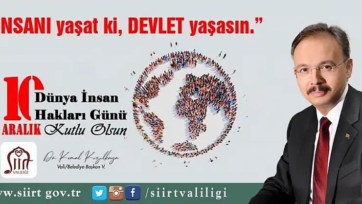 Vali Kızılkaya mesajında;“Birleşmiş Milletler Genel Kurulu tarafından 1948 yılında kabul edilen İnsan Hakları Evrensel Beyannamesi ile "10 Aralık" günü, Dünya İnsan Hakları günü olarak kutlanmaya başlanmıştır.