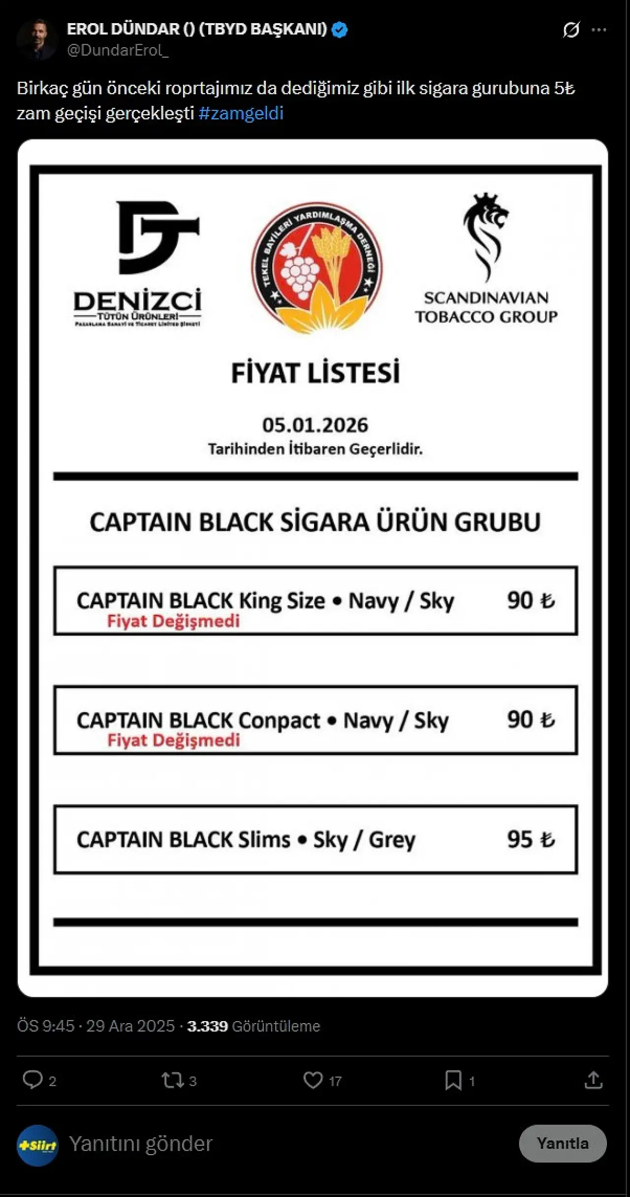 Zam kararını, Tekel Bayileri Yardımlaşma Derneği (TBYD) Başkanı Erol Dündar, sosyal medya hesabı üzerinden kamuoyuyla paylaştı. Fiyat artışı, özellikle yıl başı öncesinde sigara kullanıcıları arasında tepkilere neden olurken, önümüzdeki dönemde yeni zamların gelip gelmeyeceği ise merak konusu oldu.